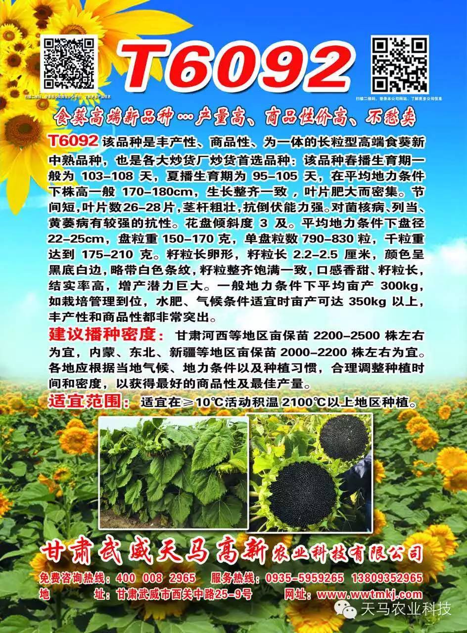 高端食葵新秀T6092;大型炒货厂采购的首选品种,该品种是丰产性、商品性俱佳的长粒型高端食葵新中熟品种:春播生育期一般为105-108天,夏播生育期为96-103天,在平均地力条件下株高一般170-190厘米,生长整齐一致,叶片肥大,叶片数26-28片,茎杆粗壮,抗倒伏能力强,对列当、黄萎病有较强的抗性,在同类品种中抗性较为突出。花盘倾斜度3-4级。平均地力条件下盘径22-25厘米,盘粒重120-170克,单盘粒数790-890粒,千粒重达到170-210克。籽粒长卵圆形,籽粒长2.3厘米,颜色呈黑底白边,籽粒黑亮、整齐饱满一致、籽粒长,口感香、是大型炒货厂采购的首选品种,结实率高,增产潜力巨大。一般地力条件下平均亩产280千克以上,如栽培管理到位,水肥、气候条件适宜时亩产可达350千克以上,丰产性和商品性都较为突出。