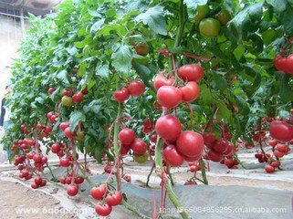 植株调整 整枝的方式主要有下列两种:(1)单干式---这种方法,只留主干,而把所有的侧枝全部摘除。(2)双干式---除主枝外,再留第一次花序直下叶腋所生的一条侧枝,而把其它的侧枝全部摘去。整枝摘芽工作不可过早或过迟,因植株各部分生长有相互的作用。叶腋的生长能刺激根群的生长,过早的摘除腋芽,会影响根系的生长,而且引起根群内输导系统的发育不完全。因此当侧芽长到cm时进行摘除,并要在晴天中午进行,以利伤口愈合。此外,在番茄的植株调整中,还要结合摘花、摘叶及摘心等工作。灌溉与排水:生长初期,需水较少,但到结果旺期,正是夏季高温季节,蒸发大,需水更多。往往每隔3-5天灌水一次,做到定时定量灌水,结合施肥(粪肥)进行,沟灌时水面不宜高于畦面。高山越夏番茄应结合降雨进行施肥。